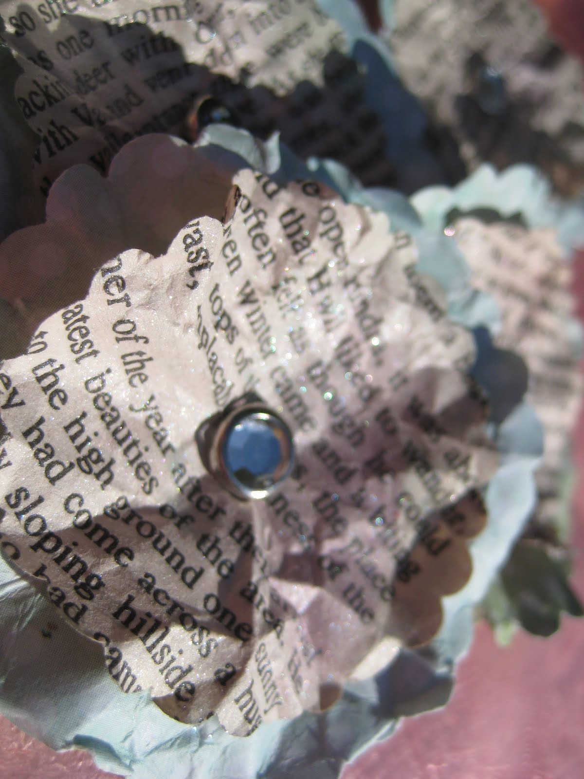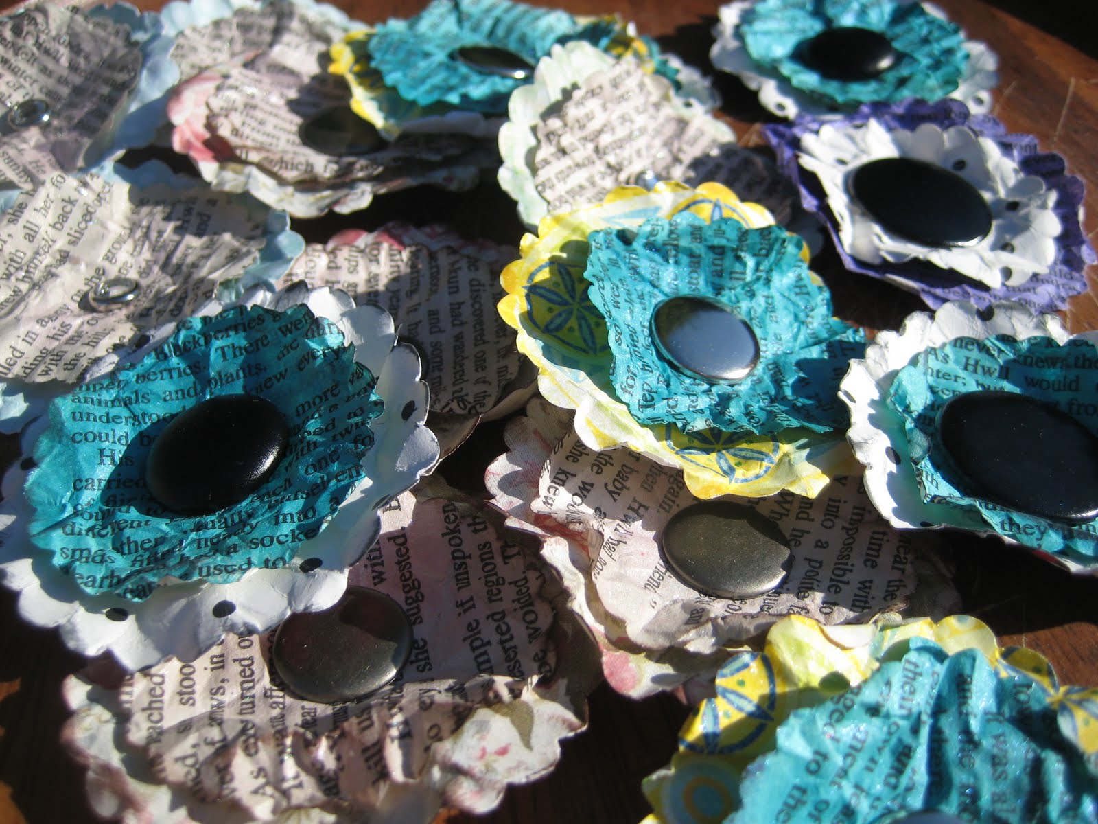 School has started back up again and I moved classrooms this year. It took a lot of extra time to decorate it but it turned out super cute. I will try and remember to take pictures to post. Not that I’m getting settled in there I will have more time for crafty things. Here a couple of things I have made for Etsy. I’ve been having so much fun making these paper flowers. I went to the thrift store and got an old book to use. After I punched them out I sprayed them with glimmer mist.
