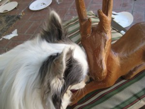 I got this paper mache reindeer at the thrift shop. I had planned on glittering it so I wanted to take before pictures. When I set it down Poncho jumped up and started licking it. It was too funny and I’m happy I had my camera!