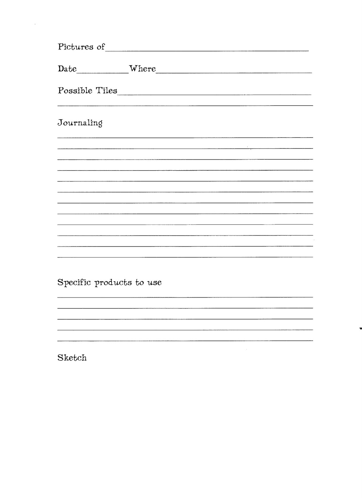 Have you ever had a specific idea or title for a layout and when you sit down to do it your mind goes blank? It happens(ed) to me a lot! My memory is terrible (really it is. I’m scared to get old, who knows what it will be like then)and I was so tired of forgetting my layout ideas so I made this form. Basically you can create it to suit your needs. As you can see below the points I wanted to document or remember are:
