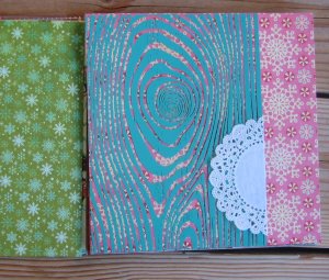 The back cover is wood. I sprayed it with a light pink glimmer mist then added the mask and sprayed a darker pink. Love the way it turned out!
