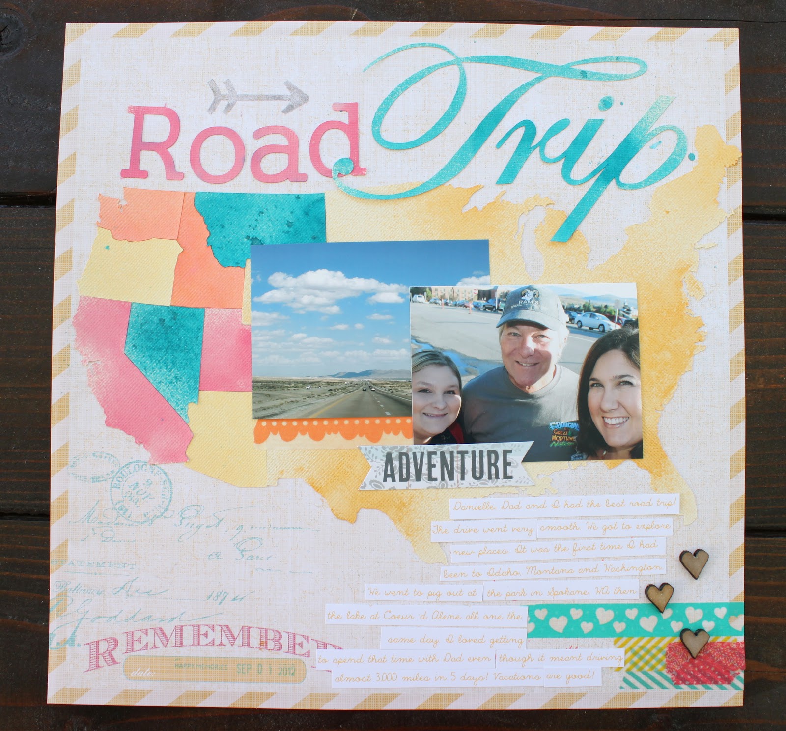Road trip layout Posted on October 9, 2012 by Cherie 1 This weekend I was able to get a little free time to play with my Silhouette. I created this layout from our recent road trip. I cut out the USA and the words ‘road trip’ with my Silhouette. Loving that machine! Share this: Click to share on Pinterest (Opens in new window) Pinterest Click to share on Facebook (Opens in new window) Facebook Click to share on Tumblr (Opens in new window) Tumblr Click to email a link to a friend (Opens in new window) Email Like Loading... Related